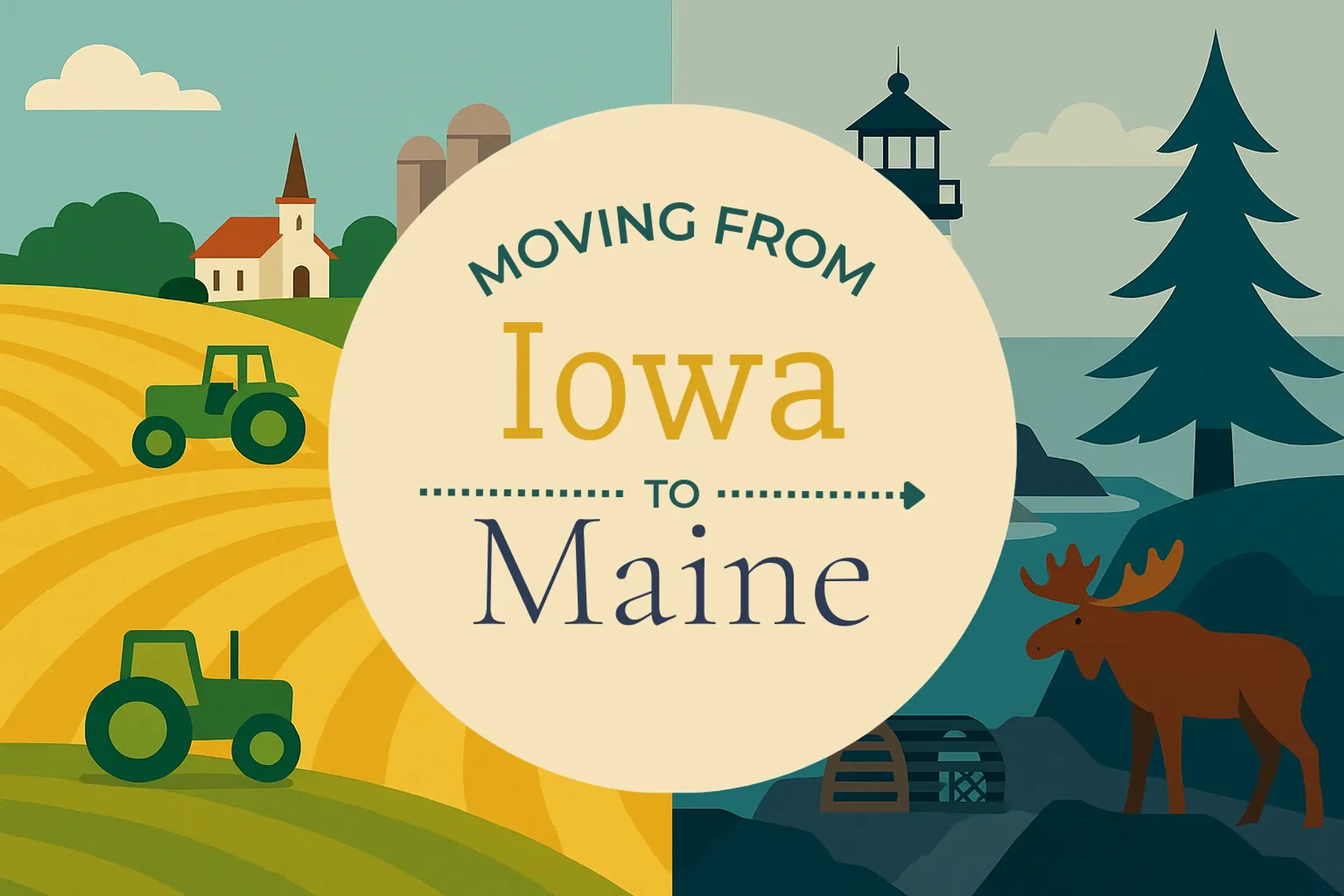 Planning a 1,422 mile interstate move from Iowa to Maine? This moving guide will help you compare living in Iowa vs Maine across 7 important categories. Compare the pros & cons (like unpredictable weather vs moderate climate), food & health (like Corn vs Lobster), real estate & housing (ranch, craftsman vs colonial, cape cod), weather & wardrobe, cost of living & taxes (it's more expensive in Maine), politics & religion, and education.